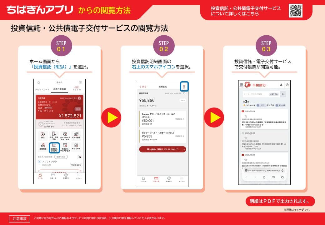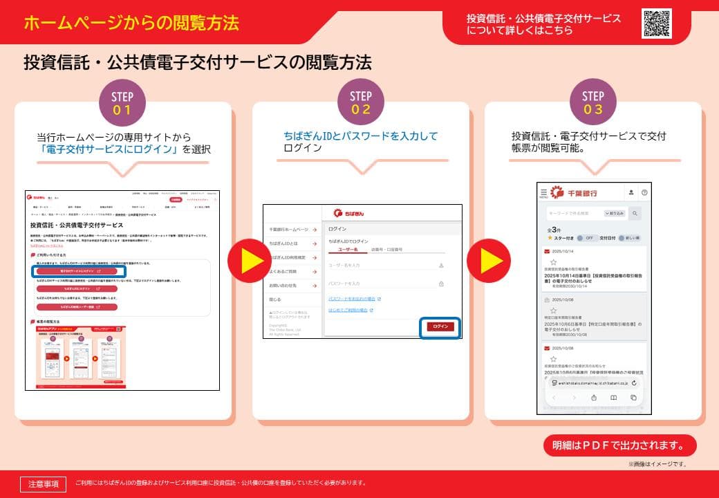 ・パソコンまたはスマートフォンにて、電子交付サービスにちばぎんIDでログインしていただくと閲覧できます。 ・電子交付された帳票は、パソコン等へ保存が可能であり、印刷することもできます。 ・対象帳票の一部のみを電子交付(もしくは書面交付)とすることはできません。 ・今後、対象書類が追加になることがあります。対象書類が追加となる場合は、千葉銀行ホームページ上でお知らせいたします。 ・電子交付から書面交付へ切替えた場合も、既に電子交付された帳票は閲覧可能期間まで閲覧できます。ただし、投資信託または公共債口座を閉鎖した場合、およびちばぎんIDを退会された場合は適用されません。 ・帳票の閲覧可能期間は5年です。閲覧開始となる月から起算し、閲覧期間最終月の月末まで閲覧できます。 ・本サービスは、メールでのお知らせは行いません。帳票の作成周期については、本ページ内の「提供対象の郵送物」をご確認ください。