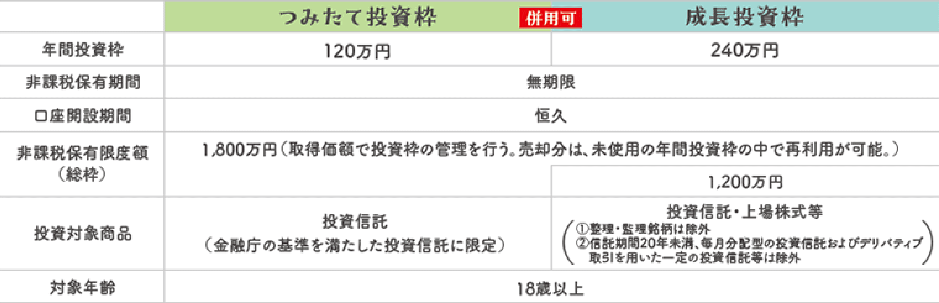 旧NISAでは、「一般NISA」か「つみたてNISA」のどちらかをライフスタイルや資産状況に応じて選ばなくてはいけませんでした。しかし、現在のNISAでは「成長投資枠」と「つみたて投資枠」の同時併用が可能となりました。