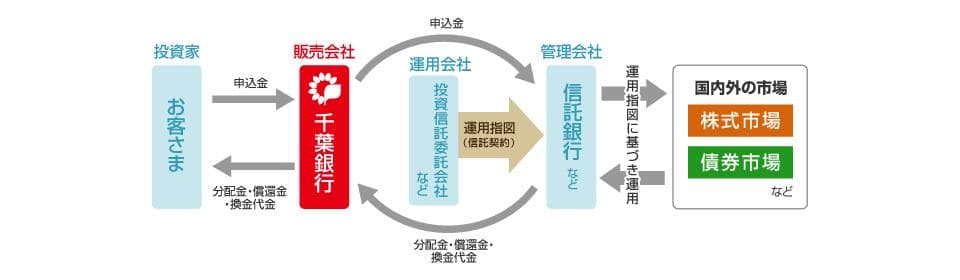 投資信託は、お客さまから集めた資金をひとつにまとめ、投資信託会社(投資信託委託会社)が複数の株式や債券などに投資し、その成果をお客さまに分配する仕組みの商品です。千葉銀行はその窓口として、お客さまへの商品説明や市況情報の提供、資金の受け渡しなどを行います。