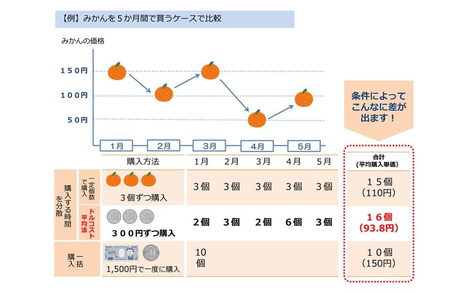 毎月一定金額ずつファンドを購入していくことにより、価格が高い時には少ない口数を、安いときには多い口数を購入することになりますので、一度にまとめて購入したり、毎回一定口数を購入する場合より、平均購入単価を平準化することができます。