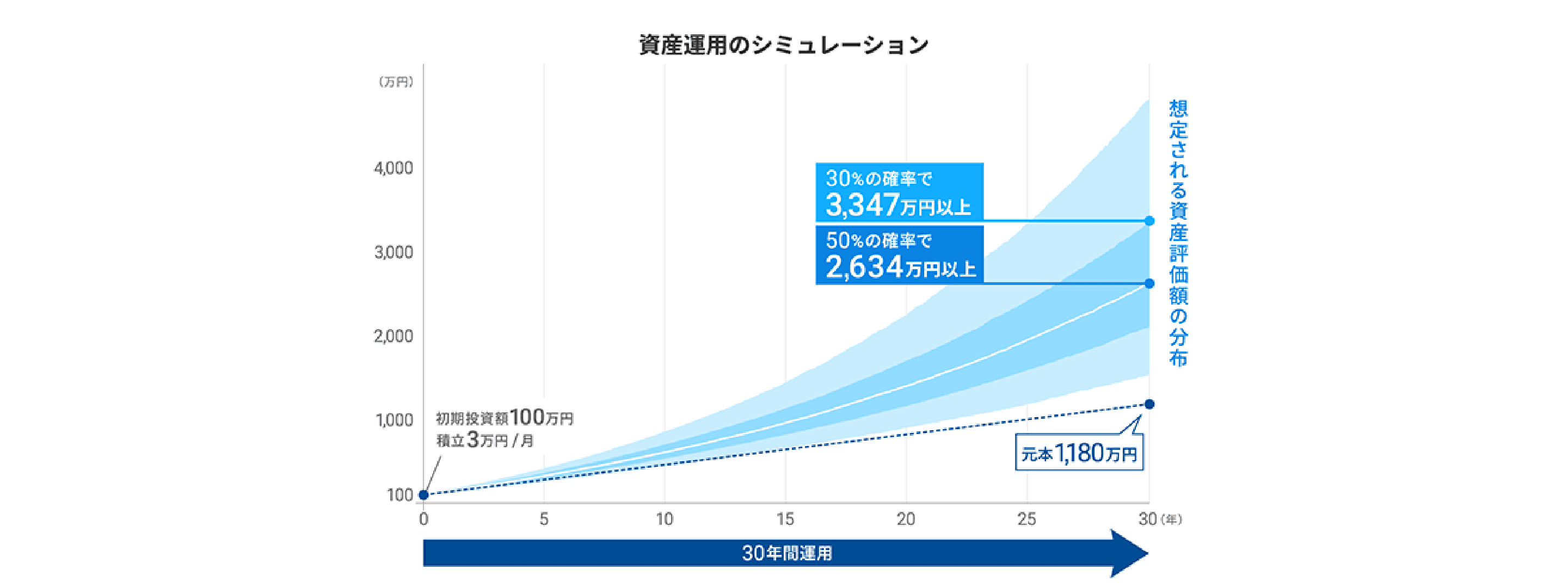 - ・2025年3月時点のWealthNaviの運用モデルに基づくシミュレーションです。「リスク許容度3のポートフォリオ」で運用した場合の将来の資産評価額の分布を、推計された期待リターンとリスク水準に基づき、毎月のリターンが正規分布する前提で予測しています。
