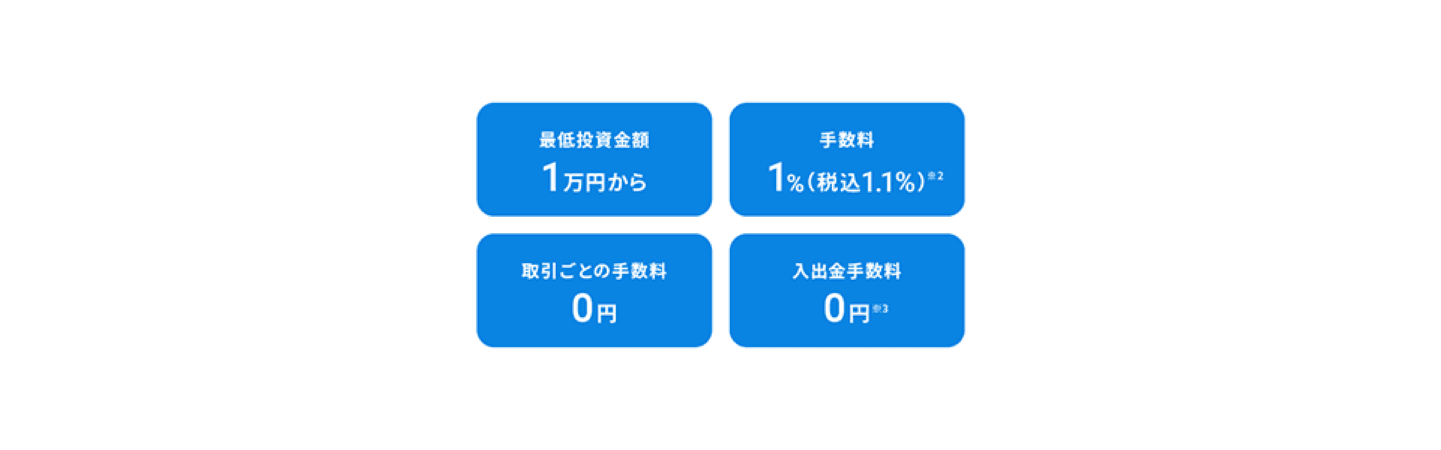 ※2 手数料は預かり資産の1%(現金部分を除く、年率・税込1.1%)、3000万円を超える部分は0.5%(現金部分を除く、年率・税込0.55%)となります。新NISAをご利用の場合、つみたて投資枠での預かり資産の手数料はゼロ、成長投資枠での預かり資産の手数料はリスク許容度に応じて年率0.7~1%(税込0.77~1.1%)、新NISA口座全体での預かり資産の手数料は年率最大1%(税込1.1%)になります。 ※3 金融機関振込の場合、振込元金融機関の手数料がかかります。