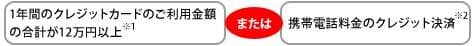 ※1 ショッピング・キャッシングリボ払い(カードローン)・キャッシング1回払いの合計金額となります。 ※2 NTTドコモ(「ahamo(アハモ)」を含む)、au(KDDI・沖縄セルラー・「povo(ポヴォ)」を含む)、ソフトバンク(「LINEMO(ラインモ)」を含む)、ワイモバイル、UQモバイル、楽天モバイルが対象となります。収納代行業者等による引き落としは対象となりません。携帯電話料金の預金口座からの引落しはクレジット決済でないため、2年目以降の年会費無料の対象とはなりません。