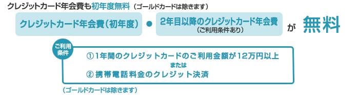 初年度のクレジットカード年会費は無料です(ゴールドカードは除きます)。 ご利用条件を満たす場合、2年目以降のクレジットカード年会費も無料となります。
