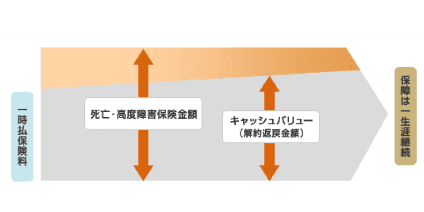 ご加入時から、一生涯の死亡保障を確保できます。 死亡保険金額は、ご加入時から一時払保険料を上回ります。 被保険者の方が所定の状態になられたときに、死亡保険金額の全部または一部を受け取れる特約もあります。