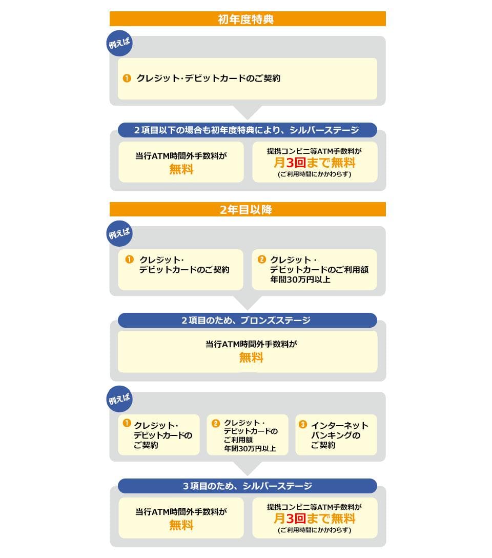 - ・初回特典として、新規に本サービスをお申込みいただいたお客さまは、設定日から2カ月後の月末まで以下の初回特典(1)(2)の通り、手数料を優遇させていただきます(本サービスは入会金、年会費無料です)。 初回特典(1):当行ATM時間外手数料無料 初回特典(2):提携コンビニ等ATM手数料が利用時間にかかわらず月3回まで無料