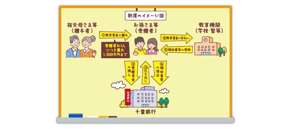 「ちばぎん教育資金贈与専用口座」は「教育資金の一括贈与に係る贈与税の非課税措置(租税特別措置法第70条の2の2)」の適用商品となります。2026年3月31日までにお孫さま等へ教育資金最大1,500万円までを一括贈与する場合の贈与税が非課税となります。