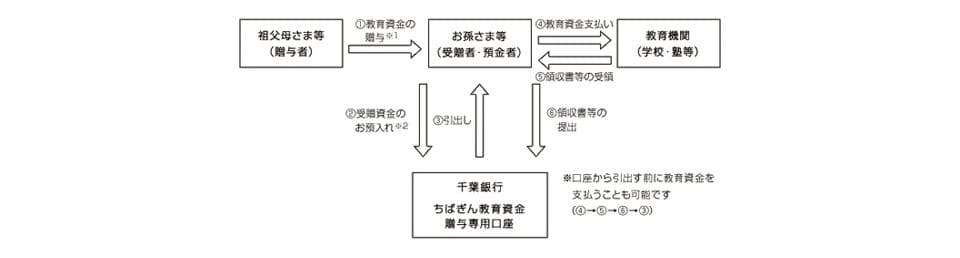 ※1. 贈与者の方は受贈者の方との間で書面にて贈与契約を締結し、受贈者へ金銭を一括して贈与。 ※2. 受贈者(預金者)の方は、受贈資金を本口座へ預け入れし、本口座の特約書、贈与契約書や教育資金非課税申告書等を当行へ提出。