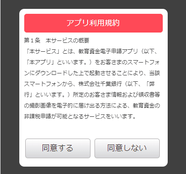 「本サービス」とは、教育資金電子申請アプリ(以下、「本アプリ」といいます。)をお客さまのスマートフォンにダウンロードした上で起動させることにより、当該スマートフォンから、株式会社千葉銀行(以下、「弊行」といいます。)所定のお客さま情報および領収書等の撮影画像を電子的に届け出る方法による、教育資金の非課税申請が可能となるサービスをいいます。
