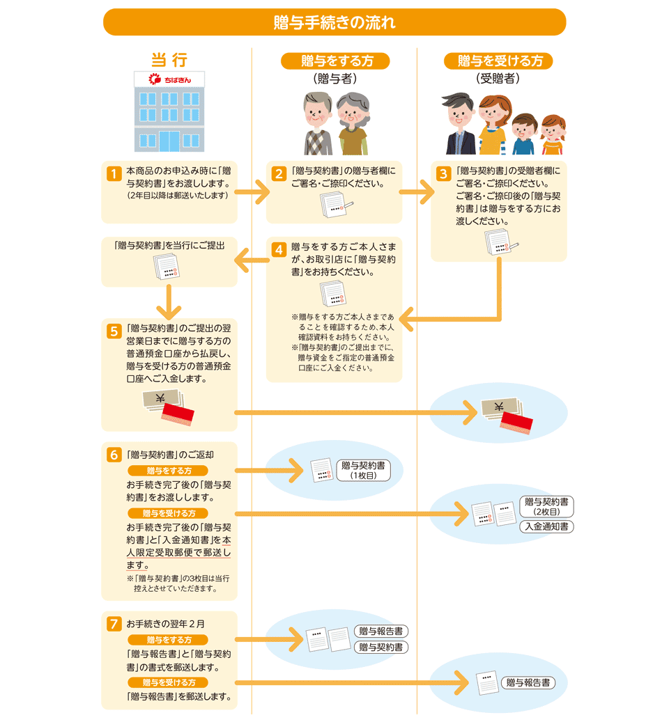 - 2.「贈与契約書」の送付 本商品指定の「贈与契約書」を毎年1月1日時点でご利用いただいているお客さまに対し、2月に送付いたします。