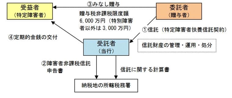 - ・この信託を利用いただくことで、特別障害者(重度の心身障がい者)の方については6,000万円を、特別障害者以外の特定障害者(中軽度の知的障がい者および障害等級2級または3級の精神障がい者など)の方については3,000万円を限度として贈与税が非課税となります。