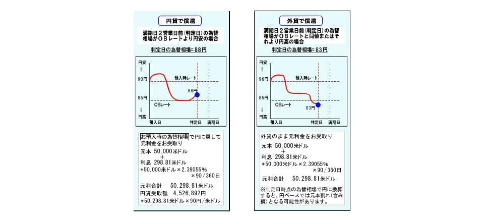 - ・通貨判定時の為替相場が、お預入時に設定した水準(OBレート)よりも円安の場合は、満期日に税引後元利金をお預入れ時の適用相場にて円貨で払い戻します。