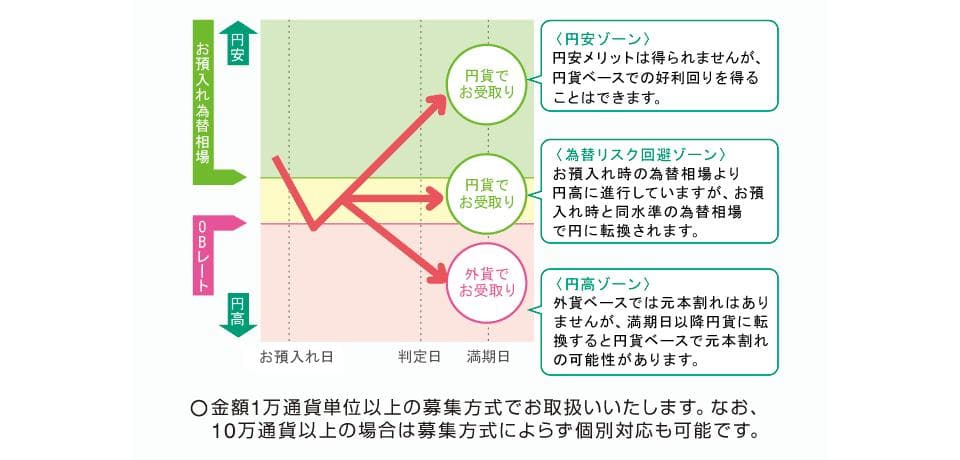 ※「OBレート」とは、満期時にお受け取りになる通貨を判定するための為替相場で、募集開始時におおまかな水準を公表し、お預入日に最終的に決定します。「安定重視型」の場合は、お預入時の為替相場よりも円高の水準に設定し、「利回り追求型」の場合は、お預入れ時の為替相場と同水準に設定します(当行が定めます)。