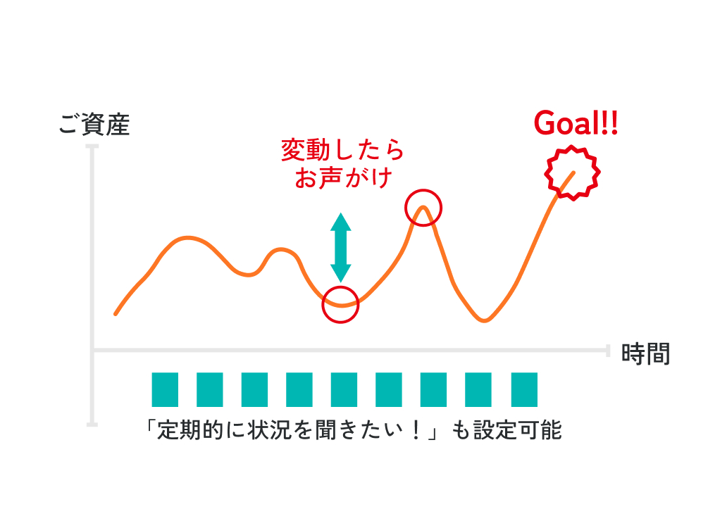 お声がけのタイミングは、定期的な運用状況のご報告や運用商品の評価額が変動した時など、自由に設定できます。