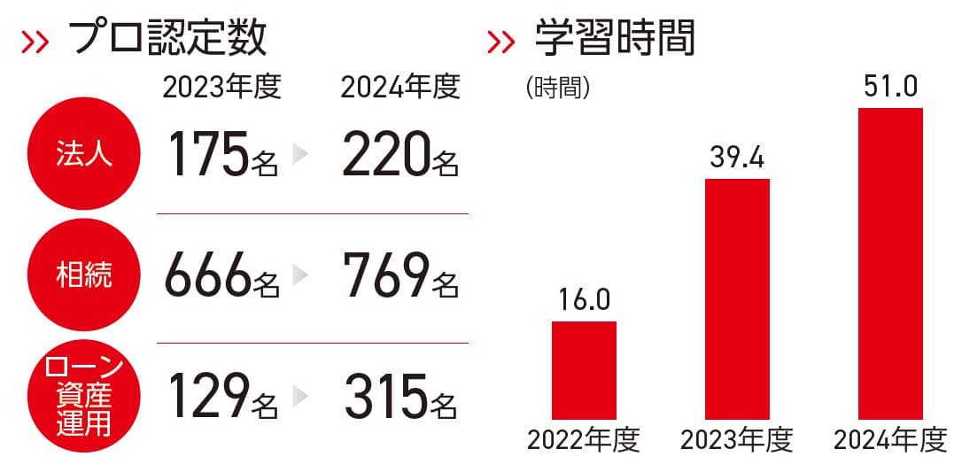当行では、営業店においてお客さまのニーズを汲み取り、コンサルティング提案を行う法人・個人分野の専門人材育成を進めています。個々人の育成度合いを可視化するとともに、対象者のモチベーション向上を図る取組みとして、一人ひとりの実績等の定量的な要素に基づく認定基準に応じて4段階(1つ星~4つ星)の認定を行う「プロフェッショナル認定制度」を開始しています。 本制度は、法人・相続関連・金融商品販売・住宅ローンの4領域で認定基準を設け、半期ごとに認定を行う制度であり、銀行全体の担当者の育成度合いについて測定をしています。 本制度に基づき、営業店における専門人材を計画的に育成し、営業店の担当者がレベルアップしていくために必要となる実践的なスキルや経験を習得する枠組みとして、2023年度より「法人・個人育成プログラム」をスタートしました。同プログラムでは、1年間の期間で法人・個人のソリューション提供を行う銀行本部及びグループ会社の専門部署における業務をローテーションで幅広く経験する実践型の内容となっており、今中期経営計画においては延べ100名の育成を予定しています。同プログラムは法人・個人領域への業務の関心が高い人材を中心とした公募制の内容であり、プログラムを終了した行員をお客さまへの提案等が実践できる営業店に配属し、実施後のパフォーマンスを測定していくことで、計画的な人材育成を進めています。