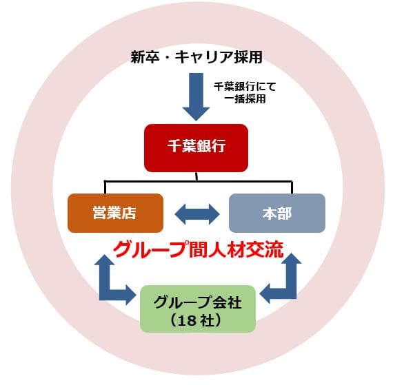 当行グループの新卒採用活動においては、能力やポテンシャルの高い人材の採用はもちろんですが、当行グループのパーパス・ビジョンに共感し、共に走り続けてくれる人材の採用にも注力しています。2024年度以降は、千葉銀行がグループ会社を含めた一体採用を行うことで、より多様なキャリアパスを実現し、グループ内での人材交流の活性化に努めています。 説明会やインターンシップの中で当行グループの業務を疑似体験する機会や、実際に働いている職員との対話の機会を多く設けることで、応募者の希望する内容と当行の業務とのギャップをなくしていくことを心がけています。