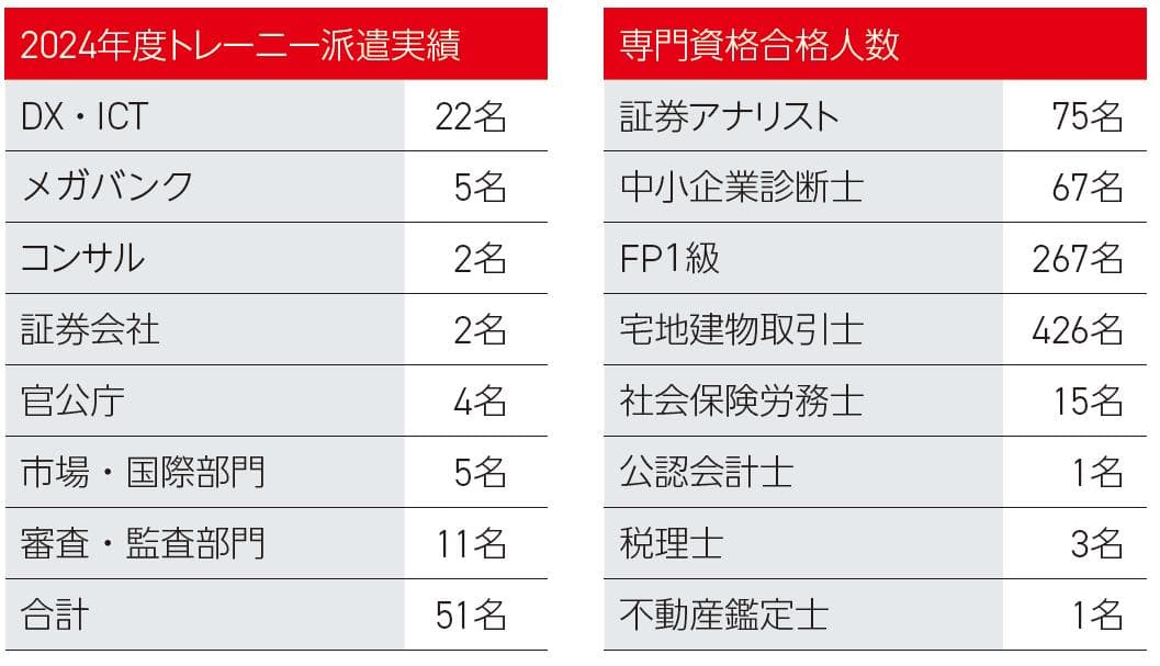 当行グループでは、DX・ICTコンサルティングや法人ソリューション、国際部門等の本部専門人材の育成に向けて、行内外に人材を派遣するトレーニー制度を積極的に行っています。2024年度は51名の人材を異業種の外部企業を含む行内外に派遣しており、今後も継続的に専門性の高い分野への人材派遣を通じて、専門人材の育成に注力していきます。また、高難度資格(中小企業診断士等)については合格者に対して最大30万円の自己啓発奨励金を支給しているなど、自己啓発の支援も進めています。