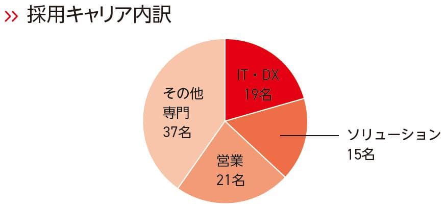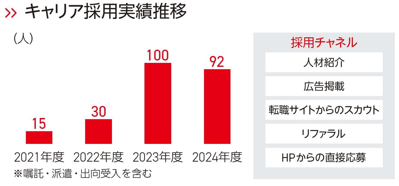 外部環境の変化を踏まえたお客さまの価値観や行動の変化に対応していき、既成概念に捉われない先進的な取組みを迅速に進めていくために、他の業界や企業から高い専門性を有した即戦力となる人材の確保が重要であると考え、キャリア採用(経験者採用)についても大幅に拡充し、2024年度は92名を採用しています。