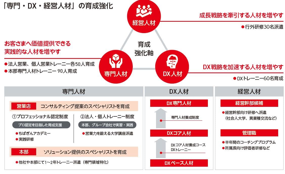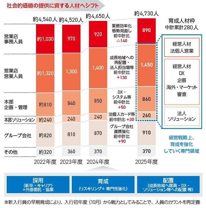 新卒採用、キャリア採用を強化し、人員の強化を図っていく一方、デジタルや法人ソリューション分野など、コアとなる人材領域において必要なスキルセットを明確化するなどして、社会的価値の提供に資する人材が、どの分野にどれだけ必要かという観点から、ポートフォリオを構築してまいります。能力・ポテンシャルの高い人材の採用、専門性を磨く人材育成、一人ひとりの強みやキャリア希望に基づく適材適所の配置を実施し、人材の「質」と「数」両方のギャップを埋めていくことで、経営戦略を実現する組織としていきます。