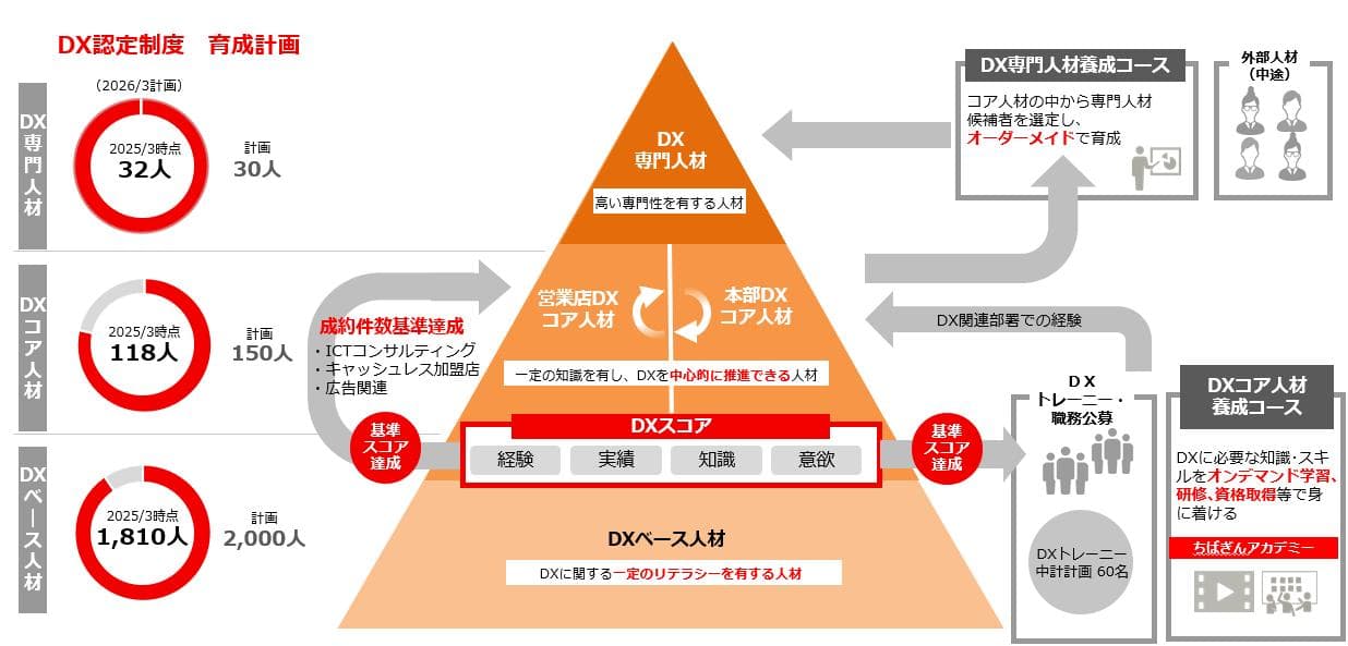 デジタル技術が進展していくなか、企業が競争力を維持し成長していくためには、DXは重要な経営課題です。当行は、アプリ開発を含めたDX推進を担う人材を計画的に育成していくため、2021年10月に「DX認定制度」を導入しました。DX人材を「DX専門人材」「DXコア人材」「DXベース人材」の3つのレベルに分けて、それぞれ認定要件を設定し、採用・育成に努めています。 DXに関する一定のリテラシーを持つベース人材は当初目標の1,000名を半年で達成するなど、早いスピードで育成が進んでおり、今後の推進体制を強固なものにするため、今中計において育成人数の目標を上方修正しました。 それぞれの領域や分野を踏まえた人材育成や人材獲得を進めることに加え、エッジテクノロジーの教育プログラムを導入して、データ・AI人材の底上げを図ります。エッジテクノロジーが提供するAI教育講座「AIジョブカレ」について、AI編は、対象とした約4,000人の受講が完了し、データサイエンス編は約100名が受講を完了しています。 当行グループでは、本年を「AI元年」と位置づけ、エッジ社との協業によって、人材の底上げを図り、AIネイティブな企業を目指します。