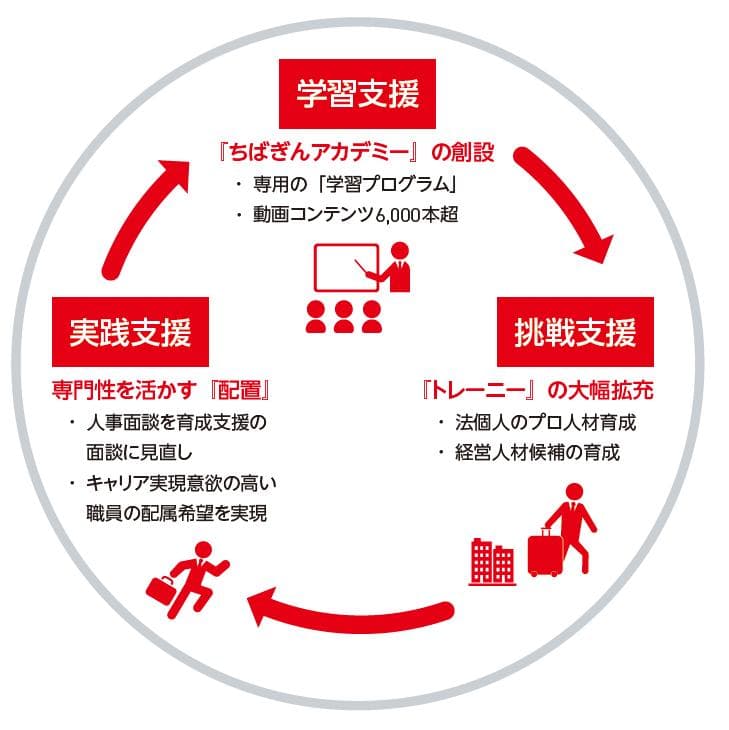 職員自らが目指したいキャリアを実現することは、お客さまへの価値提供につながることは勿論、職員自身の働きがいやエンゲージメント向上にもつながると考えており、一人ひとりが目指すキャリアの実現に向けた「学習・挑戦・実践」できる機会を積極的に提供する「キャリアステップ支援」の取組みを拡充しています。 キャリア実現に必要となる業務知識等を習得する取組みとして、ラーニングマネジメントシステム「ちばぎんアカデミー」を設立し、グループ全社に導入いたしました。6,000本を超える動画コンテンツを用意し、従業員がいつでも・どこでも学習が出来る環境を整備するとともに、一人ひとりの担当業務やレベルに合わせた学習コンテンツをレコメンドする機能を提供しています。 また、自身が希望する業務に挑戦する機会として、本部の専門業務を数日間経験できるジョブシャドウイングを実施しているほか、職員自らが手を挙げて新たな業務に挑戦するFA制度や職務公募制度についても拡充を進めています。 職員一人ひとりが目指すキャリアパスとして、中期経営計画では「専門人材、DX人材、経営人材」の3軸を強化しています。プロフェッショナル認定制度や行内外トレーニー、経営人材育成プログラムなど、領域別の人材育成体系を整備し、計画的な育成を進めています。