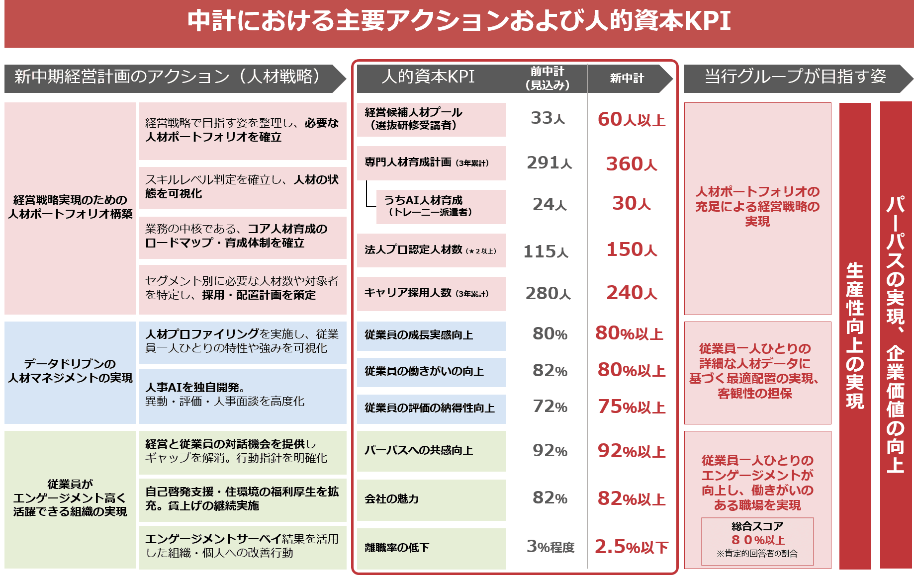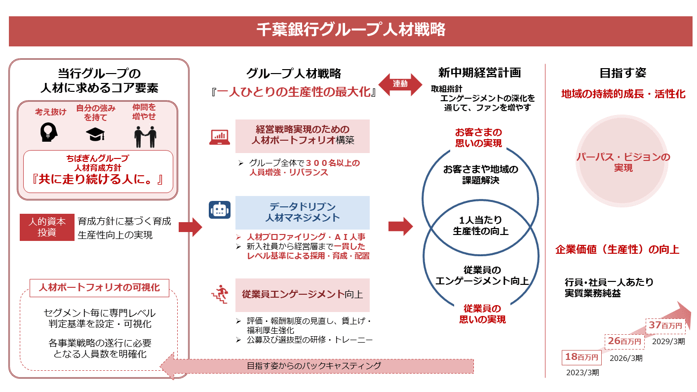 当行グループは、パーパス・ビジョンの達成に向け、新たな社会的価値を創出する組織構築を実現していくために、経営戦略と連動した人材戦略を策定しています。 人材育成方針に基づき人的資本投資を行い、『経営戦略実現のための人材ポートフォリオ構築』『データドリブン人材マネジメント』『従業員エンゲージメント向上』の3つを中期経営計画におけるグループ人材戦略の軸に定めています。人材への投資・人材の成長を起点とし、生産性の向上を実現し、当行グループが目指すパーパス・ビジョンの実現、地域の持続的成長・活性化につなげていきます。