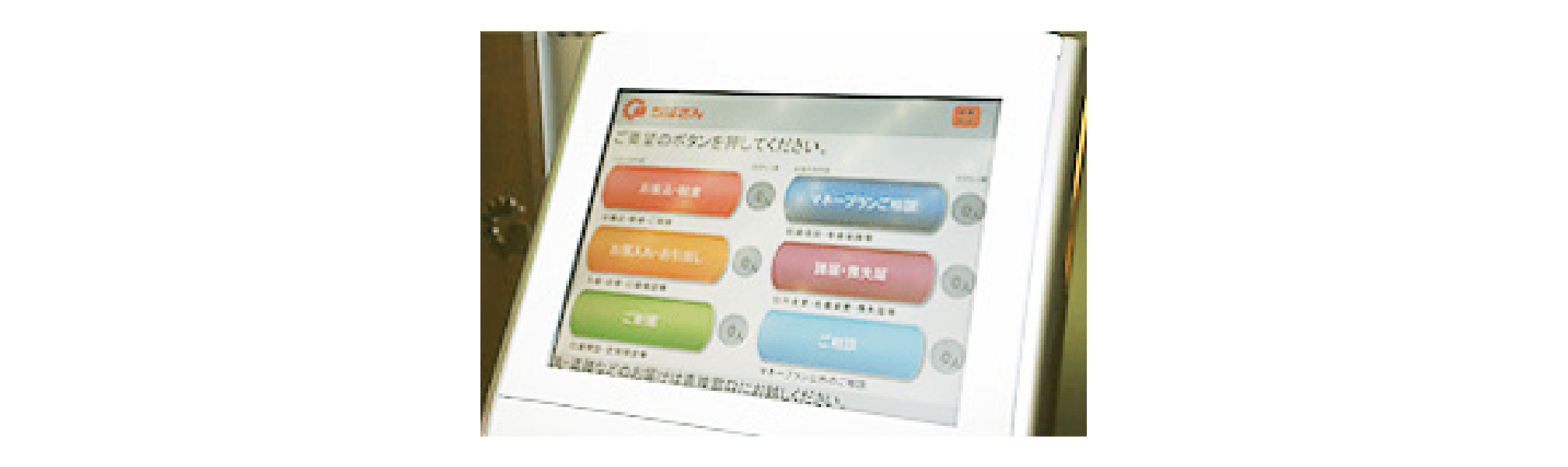 新型EQシステムを134か店に設置しております(2014年9月末現在)。従来型と比べてディスプレイをタッチパネル化・大型化するとともに、「テラー指名」機能などを加えて、より見やすく、使いやすくしております。色覚障がいをお持ちのお客さまにも見やすいよう、ユニバーサルデザインの「白色番号表示」を採用しております。 また、視覚に障がいをお持ちのお客さまを来店時に音声でご案内する来店案内システム(メロガイド)を新設店舗を中心に設置しております。