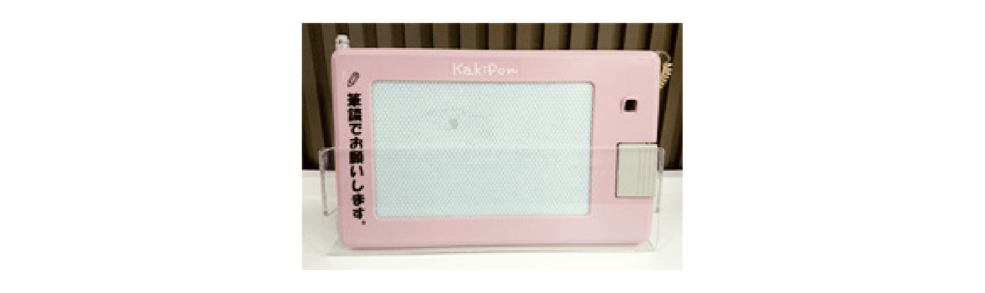 耳や言葉の不自由なお客さまにご利用いただけるよう店頭に設置しております。付属のペンで画面に文字を書くことができます。レバーを押すと文字が消えるため、記録が残らず繰り返し使えます。 全営業店に設置しておりますので、お気軽に店頭にお申し付けください。