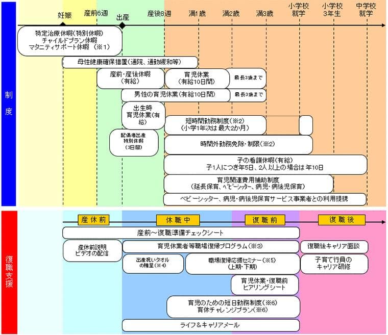 *1.チャイルドプラン休暇、マタニティサポート休暇、特定治療休暇 子どもを持ちたい職員の就業継続を支援するため、男女問わず利用できる休暇です。不妊治療の通院時等には特定治療休暇(特別休暇・年度で5日まで・不妊治療以外にも利用可能)やチャイルドプラン休暇を、妊娠中の体調不良や妊娠中の配偶者の通院の付き添い時にマタニティサポート休暇を利用できます。