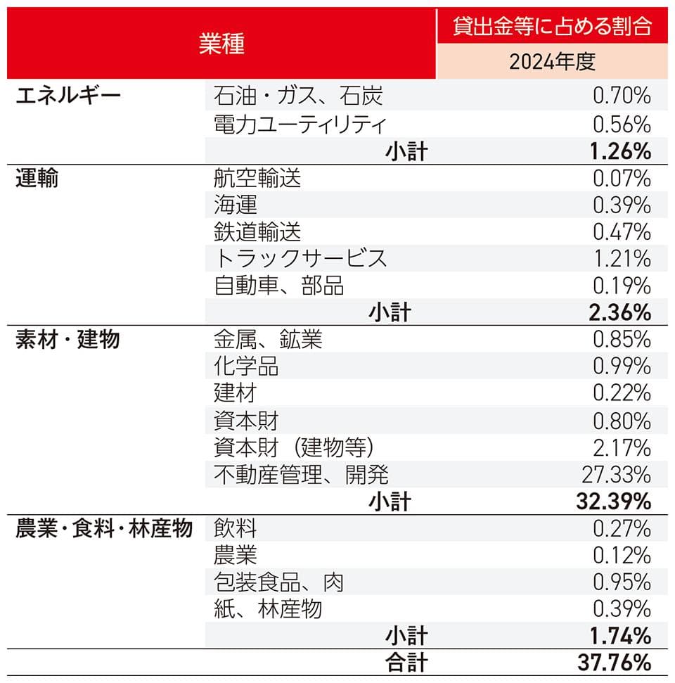 2021 年10 月のTCFD提言の改訂を踏まえ、2022年度より炭素関連資産とする対象セクターを、エネルギー※、運輸、素材・建物、農業・食料・林産物セクターに拡大しています。2025年3月末の当行の貸出金・支払承諾・外国為替・私募債(以下、貸出金等)に占める、炭素関連資産向けの貸出金等の割合は37.76%です。なお、石炭火力発電向けの貸出金等の、当行の貸出金等に占める割合は0.08%であり、石炭火力発電向け与信は2037年3月末までにゼロとなる計画です。