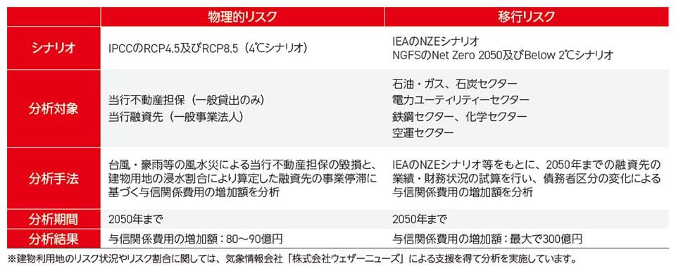 当行グループは、2℃以下のシナリオを含むさまざまな気候変動シナリオを考慮して、当行の戦略におけるレジリエンスについて分析しています。 各シナリオに基づき分析した結果、分析期間(2050年まで)における物理的リスクは80~90億円、移行リスクは最大で300億円であり、当行グループの業績(親会社株主に帰属する当期純利益(連結)742億円)等を勘案し、これらのリスクは、現時点においては、当行グループの事業の持続可能性に重大な懸念を与えるものではないと認識しています。 気候変動に伴う物理的リスク・移行リスクについては、今後も継続的に分析手法の高度化を図り、リスクの管理と適切な対応策の実施、並びに情報開示に努めていきます。
