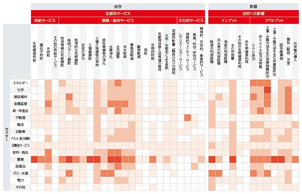 融資先の自然資本への依存と影響について把握するため、自然関連リスク分析ツール「ENCORE」を用いてヒートマップを作成し、各セクターの依存と影響の度合いを分析しました。分析の結果、融資先全体としては、水関連項目(「水供給」「水流調整」等)と防災関連項目(「土壌と堆積物の保持」「洪水制御」等)への依存が大きく、水質・土壌・大気の汚染(「土壌・水質汚染を生む有害物質排出」等)を通じた影響が大きいことが分かりました。今後は、各セクターの依存と影響の度合いと当行の融資残高割合を踏まえて重要セクターを特定し、重要セクターを中心とした、融資先の操業拠点における地域特性の調査や、リスクと機会の特定などを進めていきます。