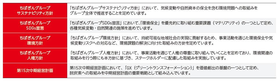 当行グループは、「ちばぎんグループサステナビリティ方針」をはじめとする各種方針・経営計画等に気候変動への対応及び自然資本の保全に関する項目を組み入れ、各種施策を進めています。