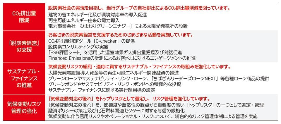 当行グループは、気候変動に伴うリスク及び機会を特定・認識したうえで、主な戦略として以下のような取組みを実施しています。