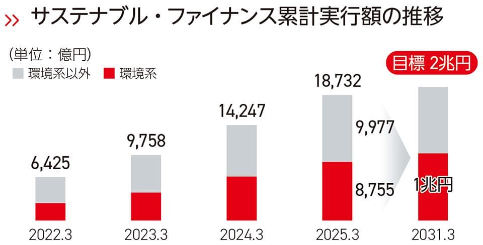 当行グループは、環境課題や社会課題の解決を資金使途とする投融資等を「サステナブル・ファイナンス」として位置づけ、取組みを強化しており、2019年度から2030年度までのサステナブル・ファイナンスの実行額目標を、2兆円(うち環境系ファイナンス1兆円)としています。 2024年度(2025年3月期)までの実行額実績は18,732億円(進捗率93%)、うち環境系ファイナンスは8,755億円(同87%)となっています。
