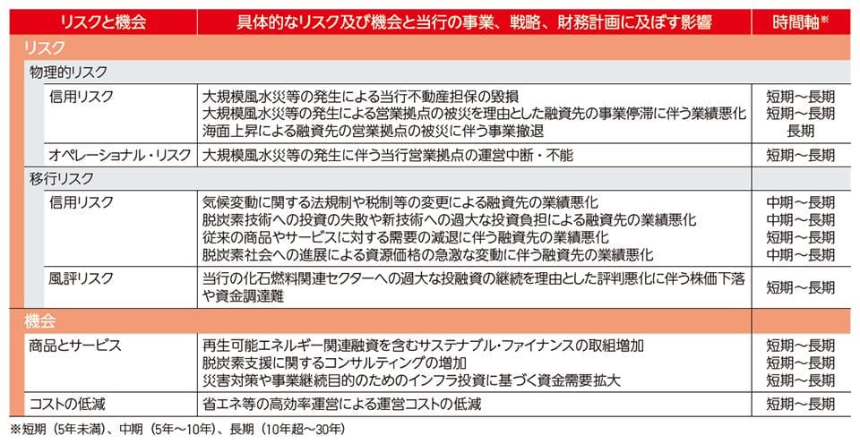 当行グループは、気候変動に伴うリスク(物理的リスク・移行リスク)及び機会について、短期(5年未満)、中期(5年~10年)、長期(10年超~30年)の時間軸で定性的に分析しています。気候変動に伴リスク及び機会の具体的な内容、気候変動に伴うリスク及び機会が、当行の事業、戦略、財務計画に及ぼす影響は、以下のとおりです。