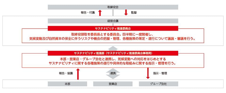 当行グループは、気候変動及び自然資本の保全に伴う依存及び影響とリスク及び機会を把握・管理するため、機動的かつ強固なガバナンス体制を構築しています。