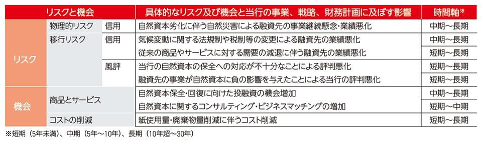 当行グループは、自然関連のリスク(物理的リスク・移行リスク)及び機会について、短期(5年未満)、中期(5年~10年)、長期(10年超~30年)の時間軸で定性的に分析しています。自然関連のリスク及び機会の具体的な内容、自然関連のリスク及び機会が、当行の事業、戦略、財務計画に及ぼす影響は、以下のとおりです。
